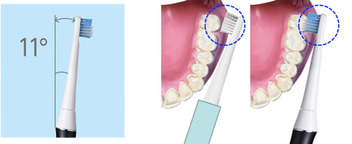 従来比約1/3に小型化した高性能マイクロモーターにより、これまで本体部分にしか搭載できなかったモーターを、ブラシの取り付け部に搭載。「メディクリーン」シリーズで好評を得ている、持ちやすい細くて軽いデザインを活かしたまま、歯とブラシのすき間ができにくく、より日本人の歯列にフィットしやすい11°の角度をつけることができました。これにより、真っ直ぐな形状の歯ブラシでは磨きにくかった奥歯の奥までブラシが届きます。