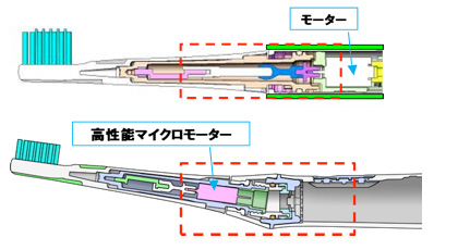 内部構造上、真っ直ぐにしか搭載できなかったモーターを小型化することで、ブラシの取り付け部分に搭載。本体とブラシの取り付け部分の角度を変えることが可能になりました。