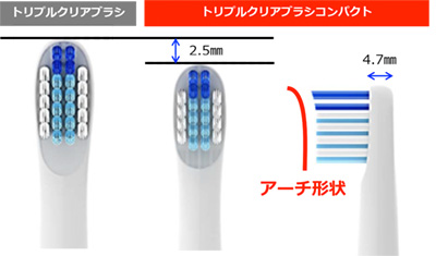 ブラシ部分を従来モデルの約20%小型化トリプルクリアブラシとの比較。毛先は歯垢を掻き出しやすい、先端が細いアーチ形状を採用。奥歯の奥まで届いて、歯垢をしっかり掻き出して磨くことができます。