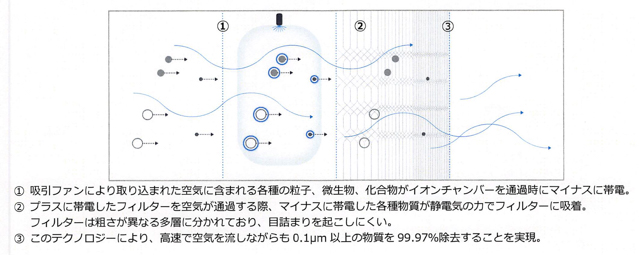 空気に放電する。空気中の浮遊物はイオン化されます。逆の極性を持つモノに引きつけられる。というわけです。