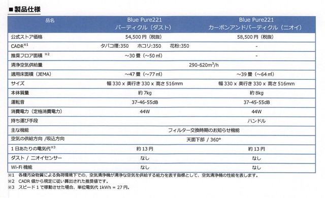 ちなみに面積が2つ示してあるのは、片方がCADR値から算出された値、そしてカッコ内が、JEMA(日本電機工業会)の値です。