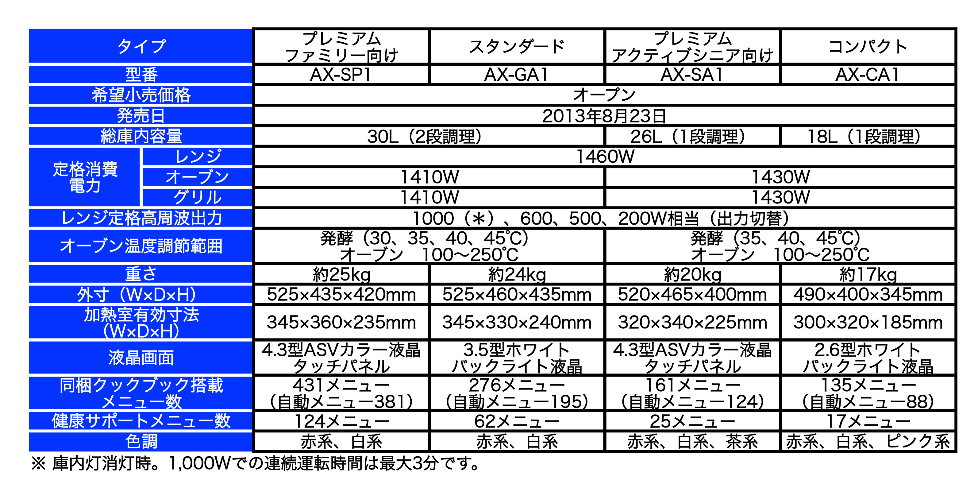 ※1 「カンタン焼き」(「牛むすび」と「えび春巻き」などの2人分)AX-SP1:約12分、AX-PX3(当社12年度機種):約20分。