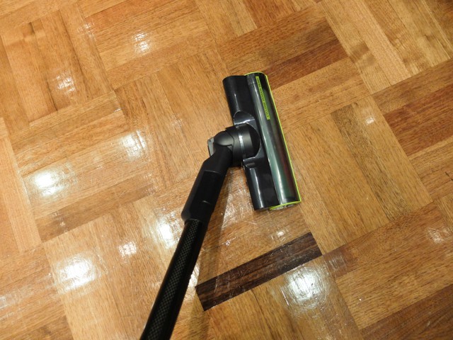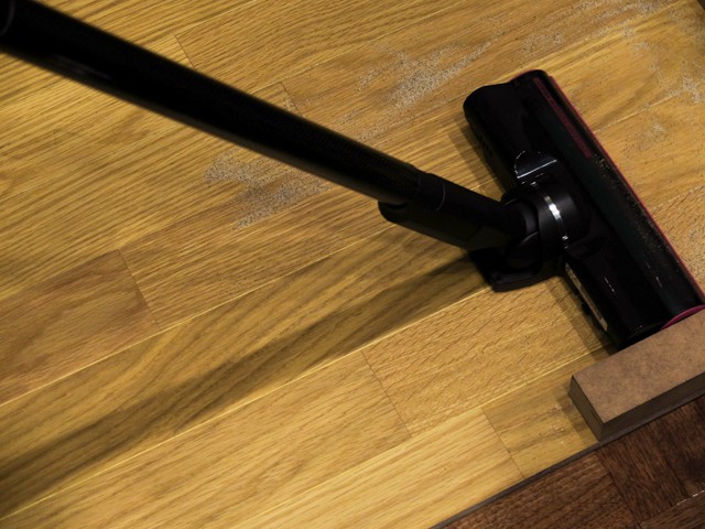 このため、スティック型掃除機と言えども、重心を床近くに取り、重さのほとんどを床で支える構造を取ります。こうすると、本体が重くても、1kg以下の少ない力で自在に操ることができます。
