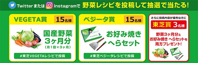 | 内容 | InstagramまたはTwitterから、野菜を使ったレシピを投稿。 投稿者の中から抽選で、それぞれ15名様ずつに次の賞品プレゼント。 ●「VEGETA賞」15名…国産野菜3ヶ月分(月1回×3ヶ月) ●「ベジータ賞」15名…お好み焼きへらセット さらに投稿内容が優秀な方に厳正なる審査の結果、次の賞品を差し上げます。 「東芝賞」3名…国産野菜3ヶ月分とお好み焼きへらセットの両方 |