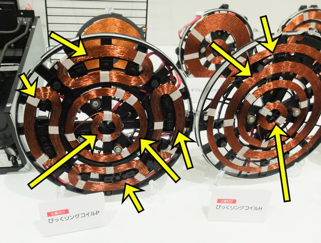 コイルを、同心円上、内側、中、外側の3つに分けた上、外側のコイルを4つのブロックに分けるのをはじめ、幾つかのパターンがあります。