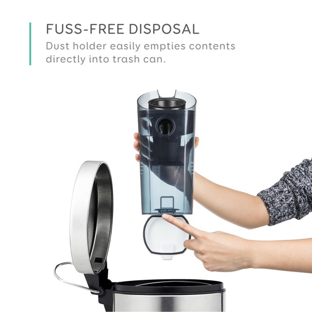 一般的な掃除機より40%以上大きい0.9L以上のダストホルダーを採用。ダストホルダーから直接ゴミを捨てることができ、手を汚すことはありません。HomeVacはコンパクト設計なので、どこにでも簡単に収納することができます。