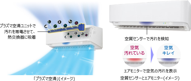 さらに、「プラズマ空清」は空気清浄だけの単独運転もできます。空気の汚れの状態は「空質センサー」で検知して集じん能力を自動制御し、室内機の「エアモニター」によるLEDの色の変化でお知らせします。