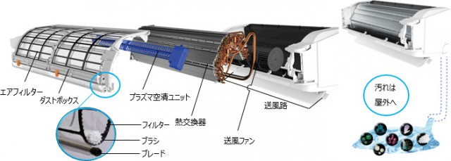 「プラズマ空清」とは、運転時に空気中の汚れを帯電させて室内機内の熱交換器に吸着し、集じんする機能。空気中に浮遊する花粉やカビを99%除去するほか、PM2.5も99%除去し、(日本電機工業会規格「JEM1467:微小粒子状物質(PM2.5)に関する除去性能」に適合)タバコの煙や細菌、ウイルスなど微細な粒子も集じんが可能です。