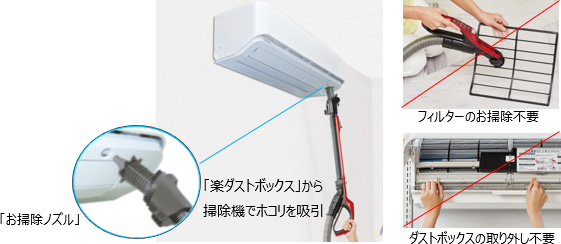 ダストボックスに溜まったホコリは、付属のお掃除ノズル注7を使用して、ダストボックスを室内機に装着したまま掃除機で吸い取ることができます。