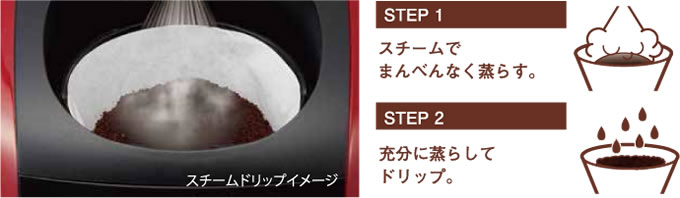1)好評を頂いているタイガーのスチームドリップ。 コーヒー粉にたっぷりのスチームをかけて蒸らすことで、コーヒー成分が抽出されやすい状態になり、最初の一杯からコーヒーのおいしさをしっかりと引き出します。