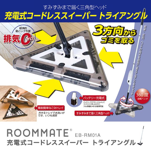(株)イーバランス「ブランド名:ROOMMATE(ルームメイト)」から、3方向からゴミを取る「ROOMMATE 充電式コードレススイーパー トライアングル EB-RM01A」が、希望小売価格:¥10,800(税込)で発売されました。