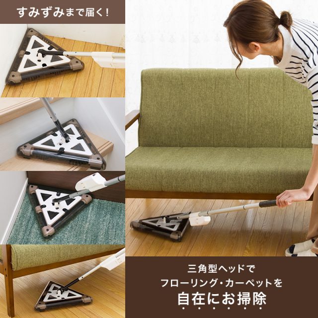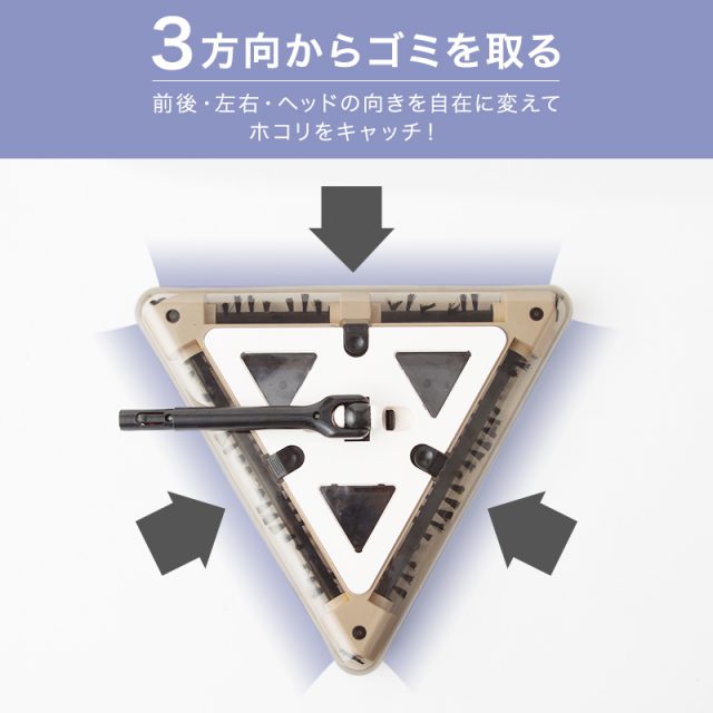 以下の様な特徴があります。。■すみずみまで届く三角型ヘッド 3方向からゴミを取り、前後・左右ヘッドの向きを自在に変えてホコリをキャッチ。