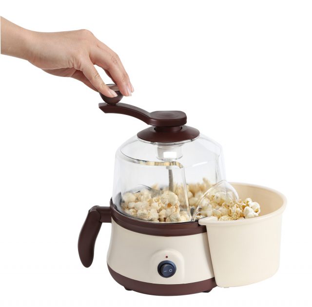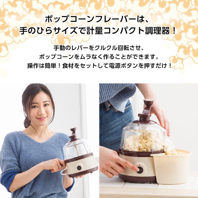「ROOMMATE ポップコーンフレーバー EB-RM9800A」は、かくはん棒がついたコンパクトサイズのポップコーンメーカー。ポップコーンの豆と少量の油を投入し、 電源を入れ本体上部のハンドルをくるくる回せば、かくはん棒が豆をムラなく焼きあげることができます。ポップコーンがはじけ始め、 ハンドルをさらに回転させるとポップコーン用カバーの開口部から、ポップコーンがボウルに入る仕組みになっています。