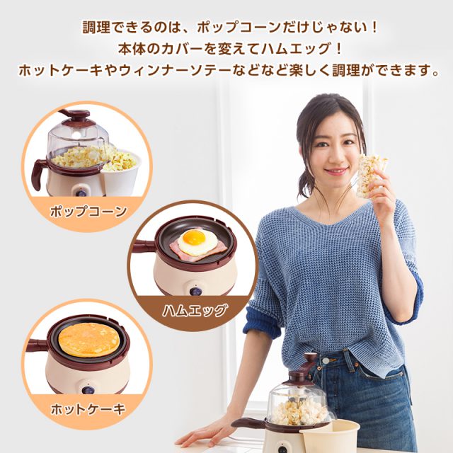 市販の「カレー塩」「唐辛子塩」「海苔塩」「緑茶塩」など、お好みの塩をポップコーンに振りかければ、バラエティーに富んだ味を楽しむことができます。油を使って調理ができるので、ポップコーンだけでなくハムエッグやホットケーキなどもOK。朝食やおやつ等、お子様と一緒に楽しみながら調理ができます。