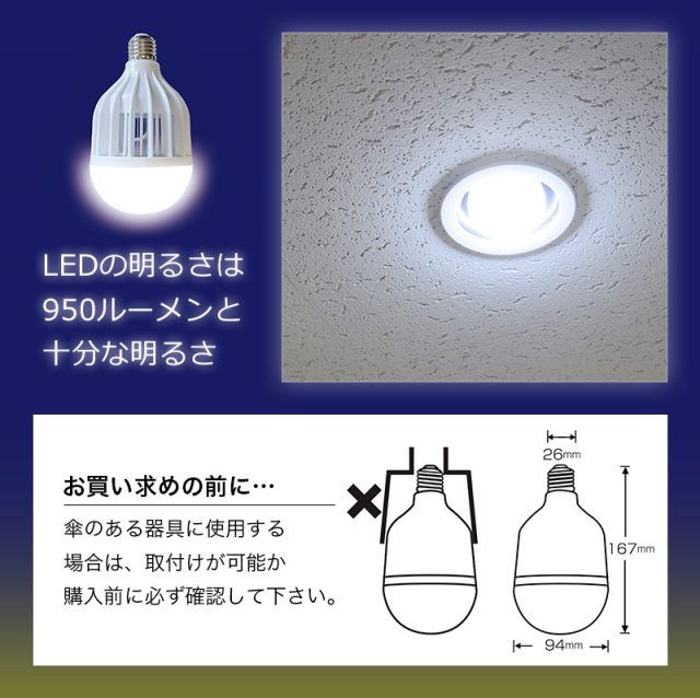 LED電球は「色温度:6500K」、「全光束(明るさ):950ルーメン」とはっきりした明るさの昼光色です。