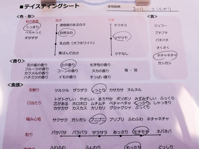 評価シートにある評価項目は「色・形」「音」「香り」「食感」「味」です。「音」は独特ですが、「粘り」は「食感」の中に入っています。