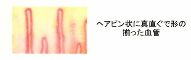 通常、毛細血管は均等に並んでいます。毛細血管が抜けて見えるような場所には、血管があるべき場所に血液が行きづらくなっていることが考えられます。■【毛細血管の形】 正常な毛細血管の形は、くし状にピンと伸びた形です。変形した血管が多くあるということは、何かしら食生活や生活習慣に改善のポイントがあると考えられます。