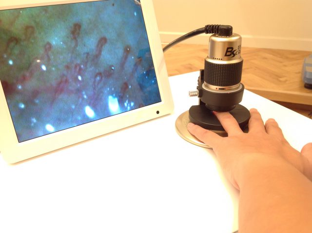 皮膚を透過して体内の血管、血流を観察する装置を使い、利き腕の反対の薬指の先の毛細血管を見ていきます。100倍と300倍で倍率を変えて、毛細血管の形・数・血流などを見ていきます。
