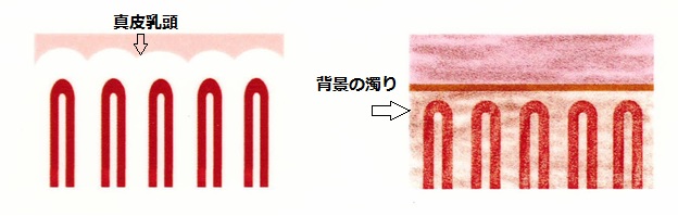 ■【真皮乳頭(基底層部分)】 血管上部を取り巻く帽子状の形(真皮乳頭)とその変化の様子を観察します。真皮乳頭が一直線で濃淡がはっきりしている場合は、コンディションが低下している傾向が考えられます。