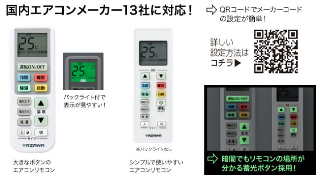 お手持ちのリモコンの使い勝手が良くない。リモコンが壊れてしまった。という方にオススメです。国内エアコンメーカー13社に対応。暗闇でも場所がわかる蓄光ボタン採用です。