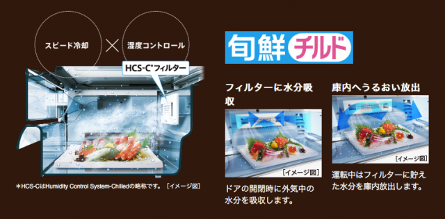 チルドルームの冷気にうるおいをプラスする「HCS-CHumidity Control System-Childフィルター」を搭載。スピード冷却と湿度コントロールのダブルの効果を実現し、「旬」な食材の鮮度をしっかり守ります。また、「旬鮮チルド」のチルドケースは、350ml缶も立てられる高さ(約15cm)で、作り置きした手料理や まとめ買いをした生鮮食品も保存しやすいビッグサイズです。