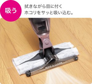 先端部の「吸う・拭く ラクラクヘッド」は、市販のワイパーシートウェットシート、ドライシートが使用可能。を簡単に装着でき、フローリングワイパーでは拭き取ることが難しい大きなホコリを、吸込みノズルで吸いながら、フローリングに残るザラつきをワイパーシートで拭き取ります。
