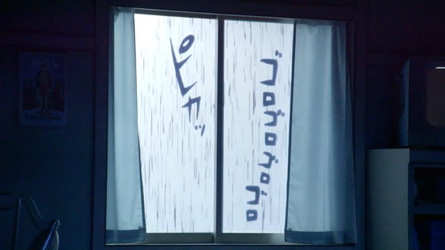 「ピカッ ゴロゴロゴロゴロ」という音と共に、「ピカッ ゴロゴロゴロゴロ」が戸に映し出されます。
