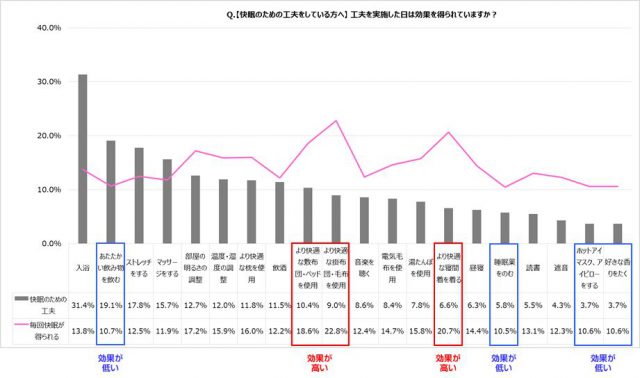 「快眠の効果は得られていますか?」と質問をしたところ、「毎回快眠を得られている」と回答が多かったのは上位から「より快適な掛布団・毛布を使用」、「より快適な寝間着を着る」、「より快適な敷布団・ベッドを使用」となりました。快適な睡眠環境を整えることは、実際に快眠を得る効果が高いことがわかります。反対に効果の点数が低かったのは、「あたたかい飲み物を飲む」、「睡眠薬をのむ」、「ホットアイマスク、アイピローをする」、「好きな香りをたく」でした。