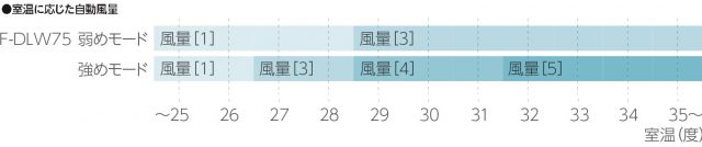 ■室内の温度を検知して風量を自動調節する「温度センサー」 「弱め」、「強め」の2モードの風量幅の範囲で、室内の温度に従い風量を自動調節。