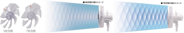■なめらかな風が広がる9枚羽根 羽根の枚数が多く、風きり回数が多いほど、風のムラを感じるリップル(風圧差)の緩急が狭くなり、肌触りの良い、木目細かくなめらかな自然に近い心地よい風を生みます。