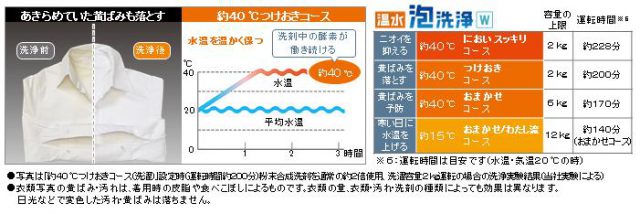 当モデルは温水専用ヒーター式の「温水泡洗浄W(ダブル)」を搭載。専用ヒーターで洗剤液をムラなく均等に温めることで洗浄力を高めて皮脂汚れや油汚れを落としやすくし、洗濯前の手洗いなどの手間を軽減します。 今まであきらめていた黄ばみまで落とす「約40 ℃つけおきコース」、部屋干し臭まで抑える「約40 ℃においスッキリコース」(どちらも容量:2 kgまで)など目的別の温水洗浄コースを搭載します。