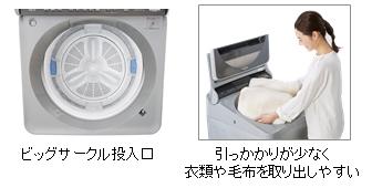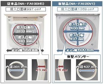 また、面積が大きく円形の業界最大NA-FA120V1のみ。 国内家庭用縦型全自動洗濯機において(投入口幅437mm)。 2018年4月5日現在。「ビッグサークル投入口」(NA-FA120V1のみ)で、衣類の取り出しがしやすくなりました。