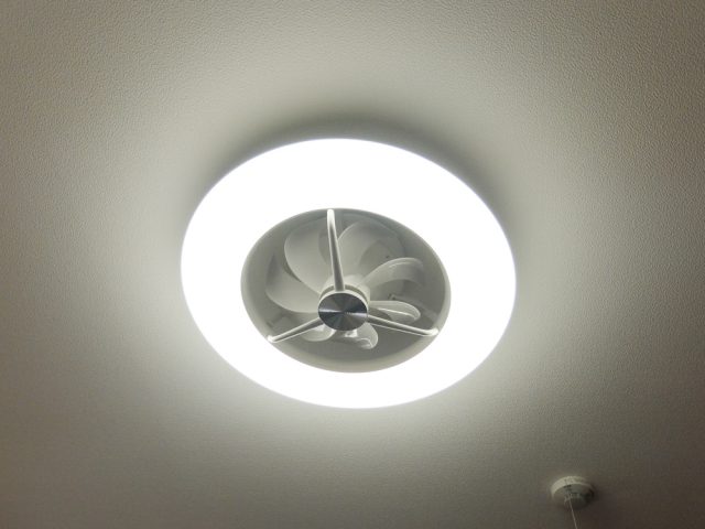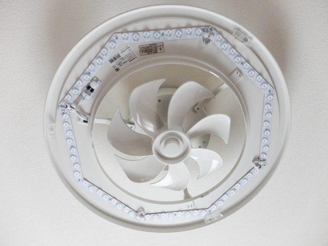 天井なので分かり難いですが、ファンの径は約30cm。扇風機にも使えそうなサイズのファンです。羽根は7枚。風を切り裂くのではなく、音を立てないように気が使われた感じです。