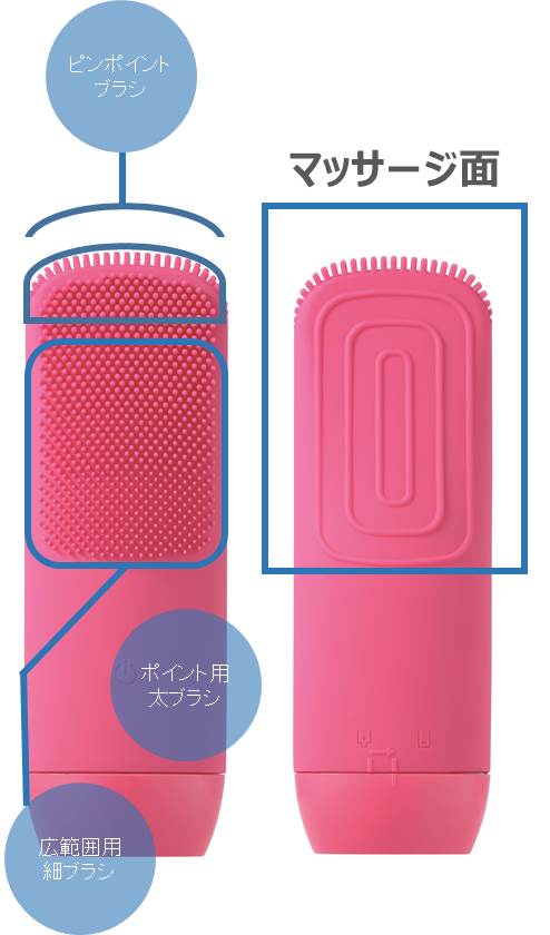 ■3つの形状のブラシ 細ブラシでは頬や額などをやさしく洗い、汚れが気になる部分は太ブラシでしっかり汚れを落とします。鼻周りなど凹凸のある細かいところには、ピンポイントブラシを沿わせて使います。