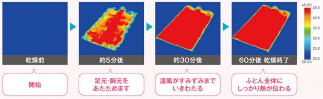 ▲ダブルサイズ、ふとん乾燥約60分の場合のあたためイメージ。(アイリスオーヤマ調べ)
