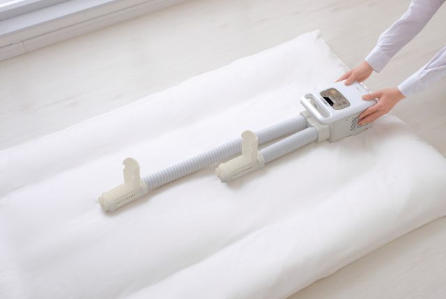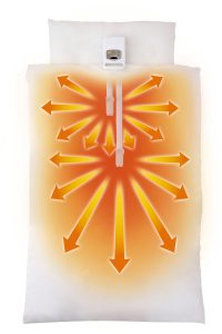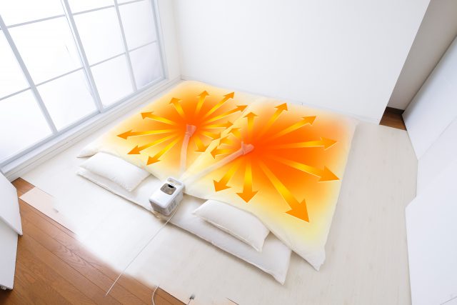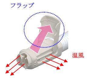 また、2本のホースの長さをそれぞれ調整することにより胸元から足元までの広範囲に温風を送れます。また、従来モデルと同様に、フラップを搭載することで敷ふとんと掛けふとんの間に空間をつくり、より広範囲に温風が行き渡ります。