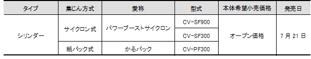 CV-SF900に加え、「パワーブーストサイクロン」シリーズCV-SF300、紙パック式「かるパック」シリーズCV-PF300が同時発売されます。