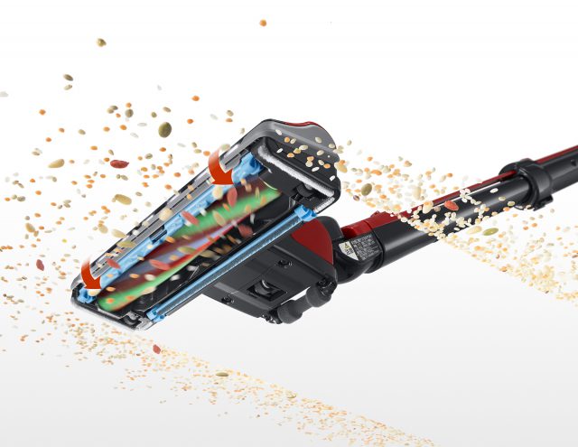 ヘッドの押し引きに合わせて、前側・後ろ側の2つのフラップが同期して開閉する日立独自の「ダブルシンクロフラップ」を採用した新「パワフルスマートヘッド」を搭載。これにより、押したときも引いたときもしっかりごみを吸引されます。また、「きわぴた構造」で、取りにくい壁ぎわのごみもすっきり吸い取ります。