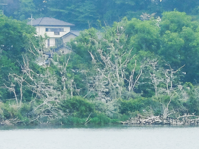 木が白色化した川鵜のコロニー。(黒いのは川鵜です)