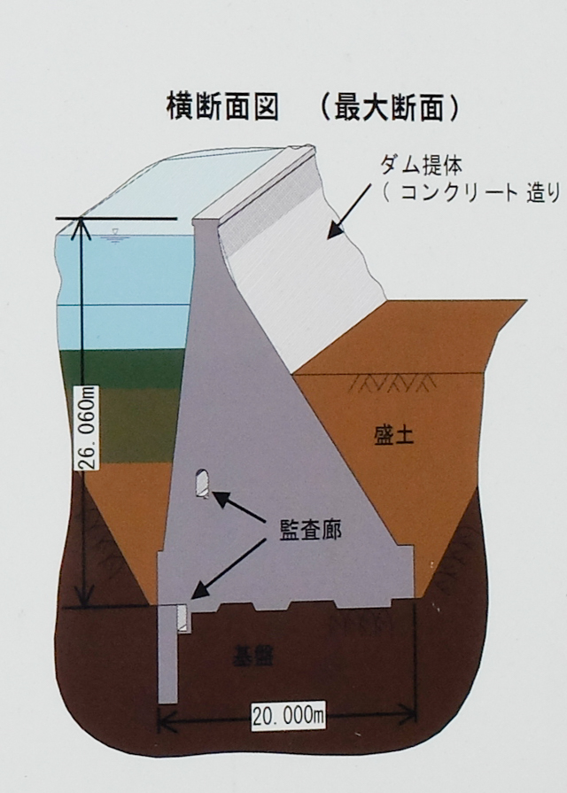 真壁ダム断面図。高さ:26.06mに対し幅:20m。