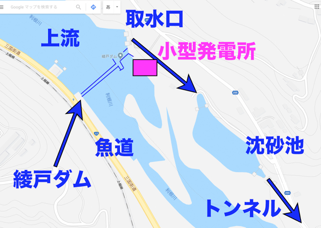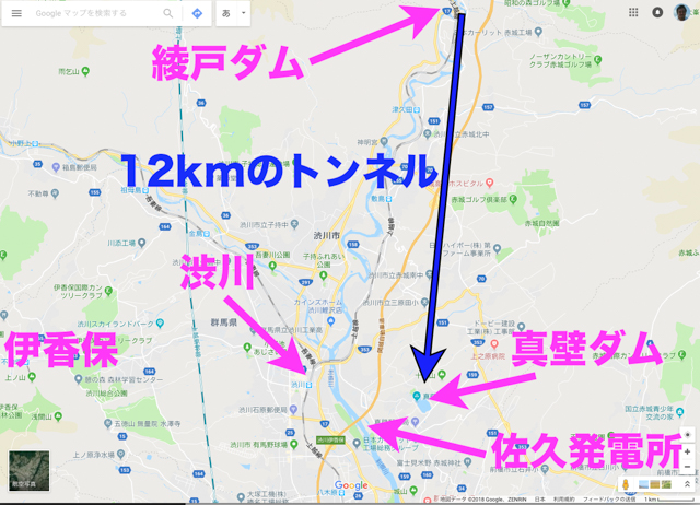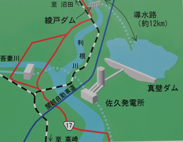今回取材した佐久発電所は、群馬県北橘町分郷八崎にあります。高崎市の北、渋川市の南東に位置し、利根川と吾妻川の合流地点より数km下ったところです。水力は位置エネルギーが重要です。高い位置で水を溜め、適量放出して、水車を回し電気を作る形を取ります。すなわち、この高い位置で水を溜めるのがダムの役割です。佐久発電所の場合、それが「真壁ダム」「真壁調整池」です。しかし、この調整池、申し訳程度の川が流れ込んでいるだけで、その川だけでは大規模な水力発電ができる水の量はありません。どうしているかというと、12km上流の「綾戸ダム」(堤高:14.45mで、15mないため、河川法では「堰」になるそうですが、通例ダムと呼ばれています)で利根川から水を取り込み、その水を山の中延々12km掘られたトンネルで、真壁調整池に入れ込んでいるそうです。水量は47トン/秒。通常の25mプールが7秒で満水となる量だそうです。