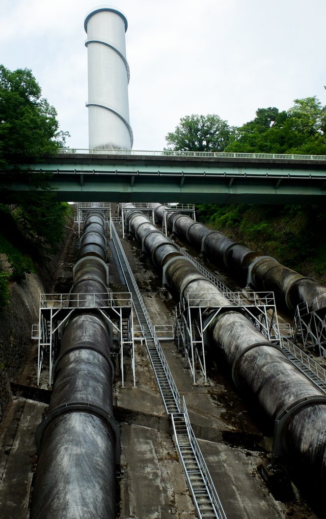 サージタンクから3つに分かれ水力発電機につながる水圧鋼管。