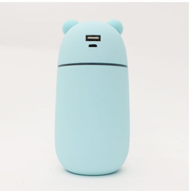 丸々とした感じのボディデザインに耳と鼻がついたパステルカラーのやさしいデザイン。鼻を1プッシュすると頭の上からミストを噴霧しやさしく加湿します。