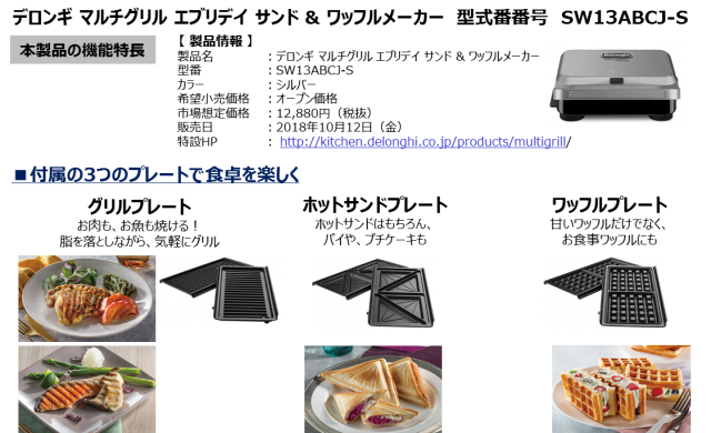 デロンギ・ジャパン(株)から、本格的なグリル料理がご家庭でもお楽しみいただける『マルチグリル』2製品『デロンギ マルチグリル BBQ & コンタクトグリルプレート(CGH1011DJ)』、『デロンギ マルチグリル エブリデイ サンド & ワッフルメーカー(SW13ABCJ-S)』が、オープン価格にて、10月12日(金)より順次発売されます。