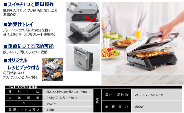 食卓でも使えるコンパクトサイズで、エブリデイの名の通り、毎日お使いいただけるように、「グリルプレート」「ホットサンドプレート」「ワッフルプレート」の3つのプレートが付属しています。朝食からランチ、ディナーまで、 幅広いメニューをお楽しみいただけます。スイッチひとつで運転するので、どなたでも簡単にお使いいただけるのも特徴です。さらに、余分な油を受け止める「油受けトレイ」や、垂直に立てて狭いキッチン周りでもスッキリ収納できるなど、使い勝手のよさも魅力です。