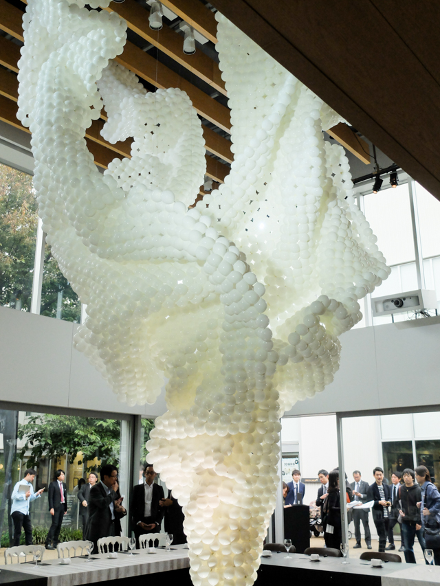 テーマは「生命の循環」。タイトルは「気化ーvaporization」。一粒ひと粒のバルーン(水滴)を美しく密に組み合わせ、炊きたてのごはんの小腸ともいえる水蒸気をダイナミックかつエネルギュシュに描いたそうです。