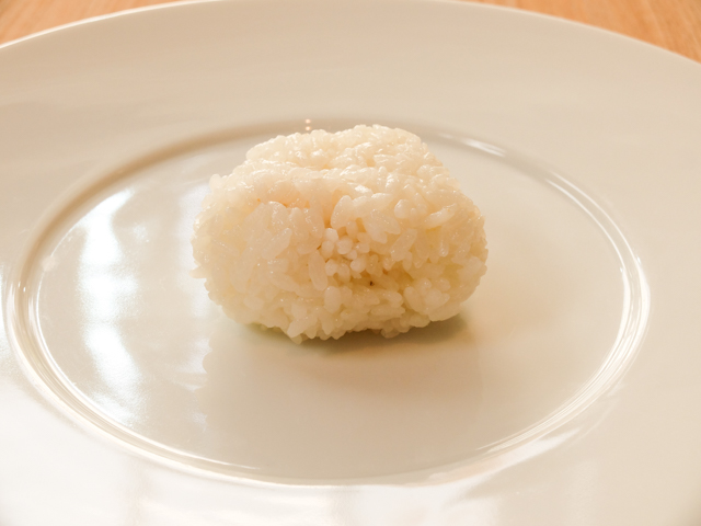 おにぎりの特長として、「具」をお米が包んでいることが上げられます。おにぎりは、元来、お米を食べるモノですから、具に比べて、お米の比率が高いわけです。特に具材が「フォワグラ」ともなると味は濃厚。要するに、かなりのお米と一緒に食べなければと判断し、半分を一気に食べました。フォワグラのの濃厚な味のあと、米の味と香りが追いかけます。