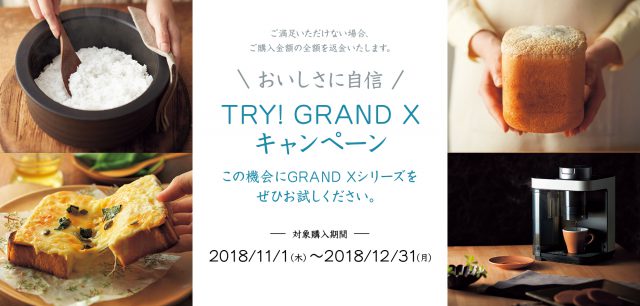 ●キャンペーン期間:2018年11月1日(木)~2018年12月31日(月)「GRAND Xシリーズに興味はあるけれど、味や使い勝手が気になる」といったお客様のお声を聞き、実際にご家庭でGRAND Xを使用してそのおいしさを体感いただきたいという想いから本企画されたキャンペーンだそうです。