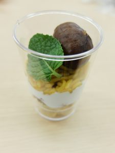 当日は、安納芋モンブランのグラスデザートも作った。底の方に黒糖米粉パンが入っている。