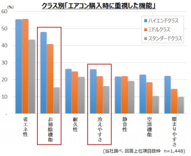 近年、「省エネ性能」以外にルームエアコンに求められるニーズとして、特に高性能タイプを求めるお客様ほど、フィルター自動掃除等のお掃除機能や早く冷えるための冷房能力、また空気清浄機能等が重視されています。 (東芝調べ、インターネット調査、対象:20~69歳の男・女(n=1,448)、期間:2018年11月)